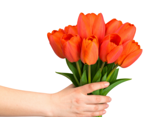 Close-up of hand holding a bouquet of beautiful orange tulips isolated on a png file
