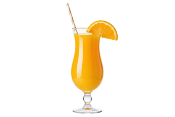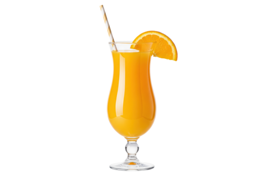 orange juice in a hurricane glass with a paper straw and orange wedge garnish, isolated cutout