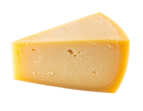 A wedge of hard cheese with a light orange hue and slight imperfections