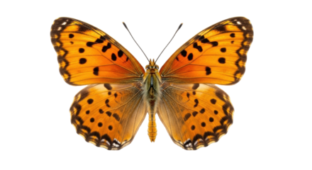 Isolated butterfly with orange wings and black spots, close-up view, insect beauty
