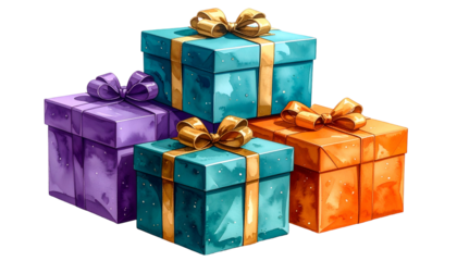 Watercolor illustration of four colorful wrapped gift boxes with tied ribbon bows