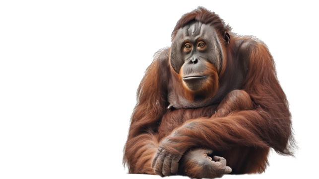 Portrait of a majestic orangutan sitting with calm expression, isolated on white background. Perfect for wildlife themes and educational use.on transparent background