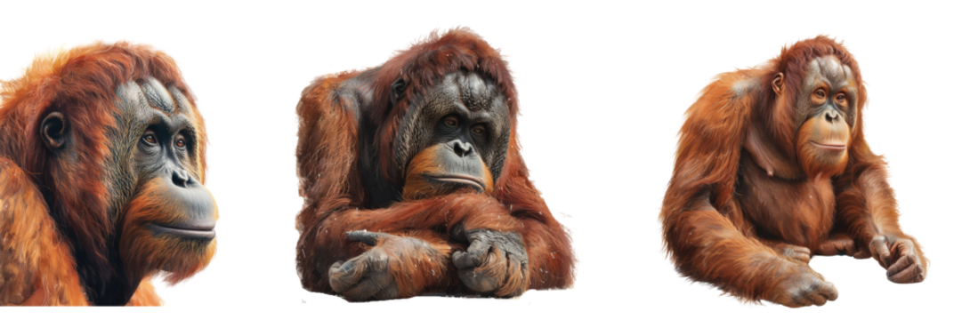 Set of orangutan sitting in different poses isolated on transparent PNG background, oil paint