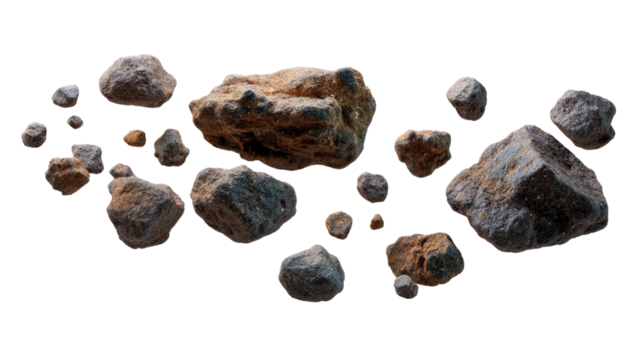Isolated swarm of asteroids floating in space, showcasing diverse shapes and textures against a transparent background