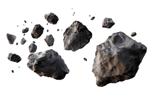 Scattered asteroids and space debris float the void isolated on white or transparent png.