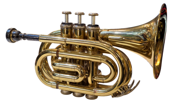 Golden trumpet isolated PNG on transparent background, brass wind instrument for jazz music and orchestral performance