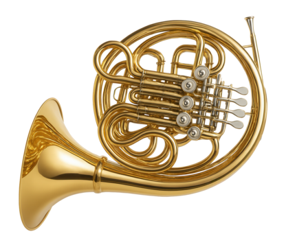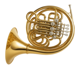 Vintage brass French horn with its characteristic coiled pipes and rotary valves, a beautiful classical orchestral wind instrument. background removed
