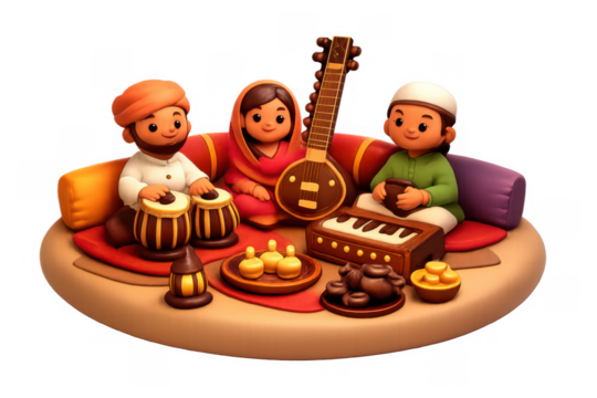 Cultural music gathering with traditional instruments and food for easter design