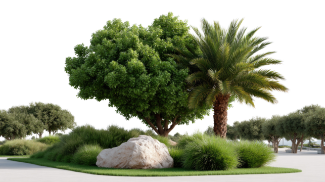Lush Landscape Display: A beautifully orchestrated garden scene, complete with a mix of varied foliage and a majestic Palm, exudes tranquility and aesthetic beauty.