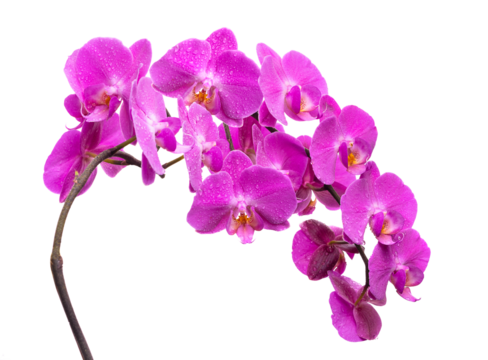 PNG. A branch of a blooming lilac orchid with dew drops on a white background. Isolate on white background
