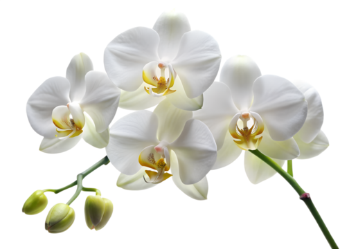 Beautiful white orchid flowers are blooming on a stem, isolated on transparent background