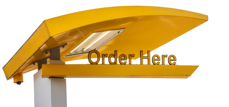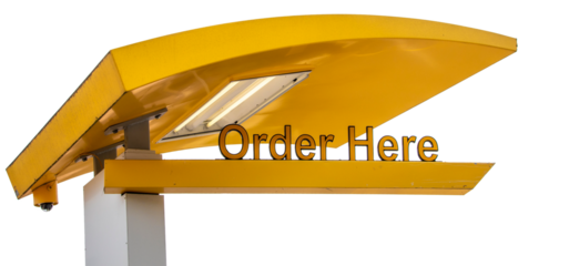 Yellow drive through resturant light on pole  and sign saying Order Here with light - isolated on transparent background