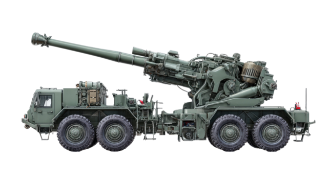Portable self-propelled artillery featuring retractable support legs.