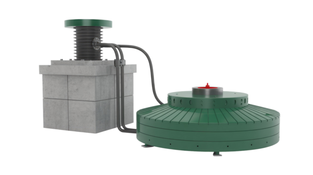 A green, ribbed disc-shaped device connected by hoses to a concrete block with a corrugated pipe and cap. background removed