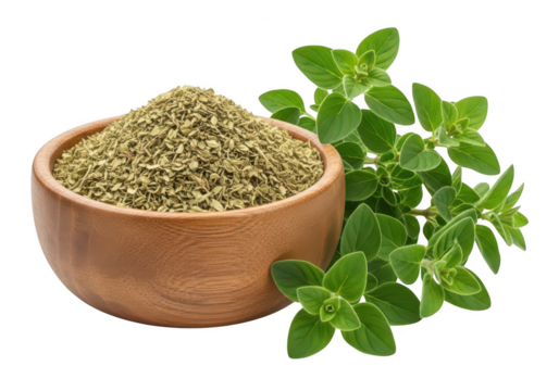 Rustic wooden bowl filled with dried oregano next to fresh oregano sprigs herb spice