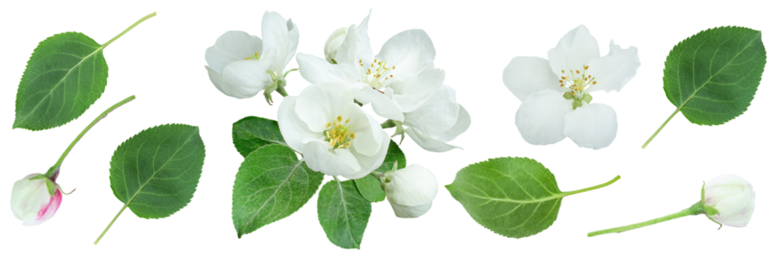 Apple tree flowers and green leaves isolated on transparent background. Banner.