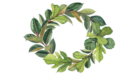 Watercolor wreath of diverse green plant leaves on black background foliage