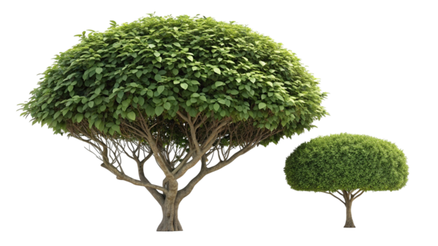 Two Lush Green Trees with Detailed Roots and Leaves on Pixelated Background two trees