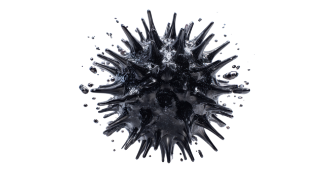 Microbe organism with spiked surface and liquid drops, representing a virus, infection, or disease on a transparent background