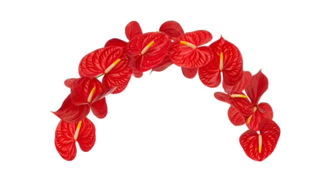 Vibrant red anthurium flowers arranged in a decorative arch, symbolizing love and exotic beauty