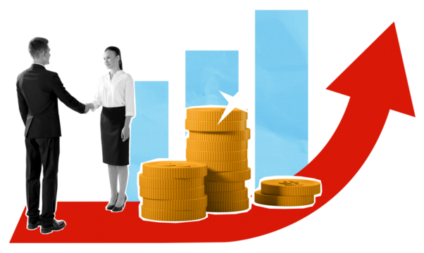 Businesspeople shaking hands with stacks of coins, upward red arrow, and bar chart on a white background. Concept of financial success and partnership