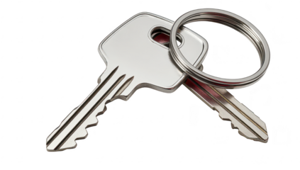 Close-up view of two metallic keys attached to a keyring. positioned against a clean white background. ideal for illustrating security. access. or home-related themes