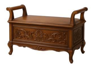 Charming storage bench with carved details, perfect for linens in a guest room.