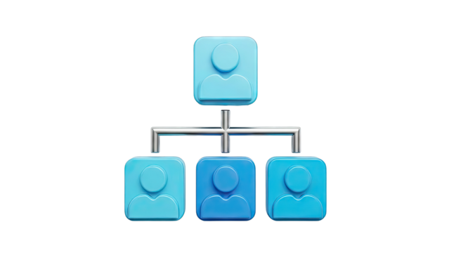 Blue organizational chart diagram with connected rectangular silver metallic nodes, isolated on a transparent background