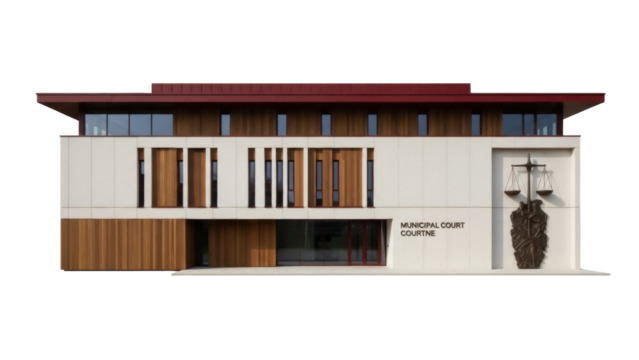 Isolated modern Municipal Court building exterior facade in daylight, courthouse structure