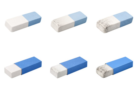 Eraser collection in various designs and conditions for office and school stationery concepts