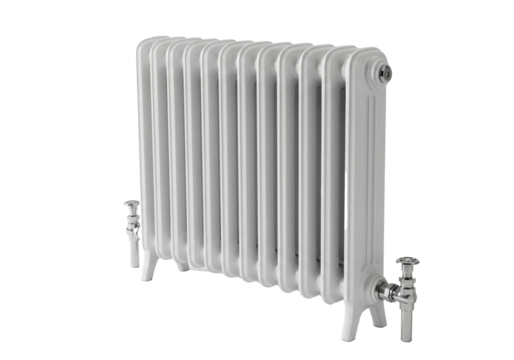 ultra-detailed cgi render of a vertically oriented, traditional white cast-iron column radiator with ornate period styling, isolated on a transparent background, concept of luxury technical