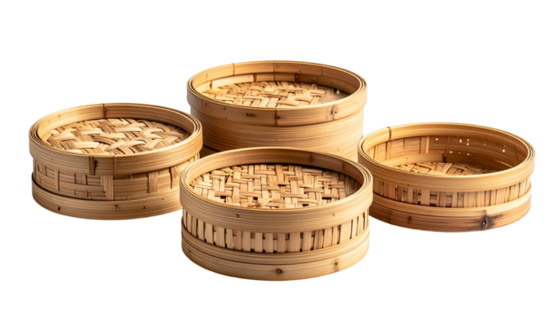Four round bamboo steamers, empty and stacked, isolated on black, offering dim sum style cooking