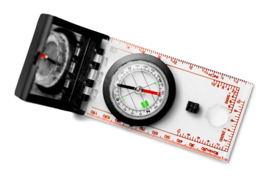 Essential gear for adventurous hiking with backpack and navigation tools for outdoor exploration on transparent background