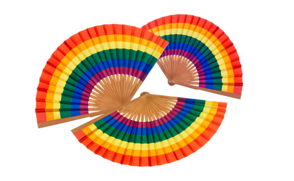 Composição colorida com leques LGBTQIA+ com as cores do arco-íris representando pluralismo e diversidade de gênero