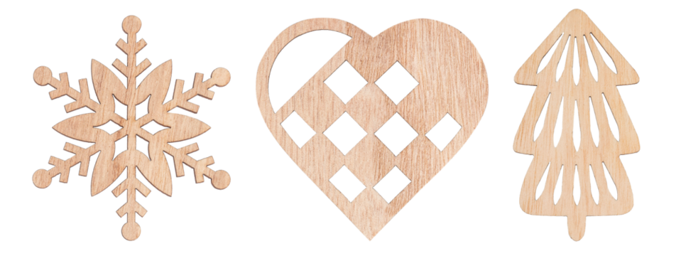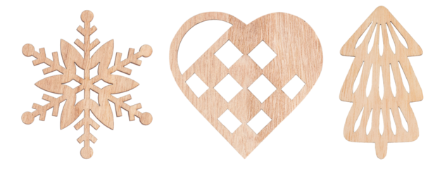 Collection of wooden Christmas decorations including snowflake, heart, and tree shapes isolate