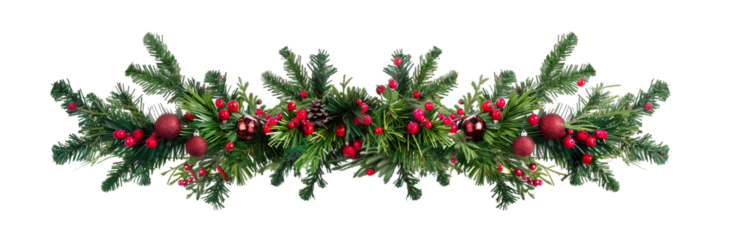 Festive natural evergreen branch garland decoration transparent PNG cutout, isolated background. Christmas ornament with baubles and pine cones graphic resource