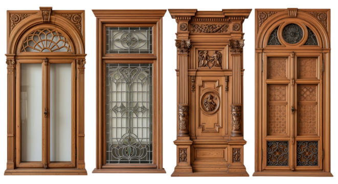 A set of  vertical vintage windows with ornate wooden frames displayed against a light background. Each window showcases unique classical architectural details.