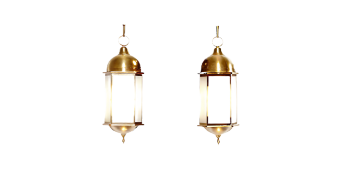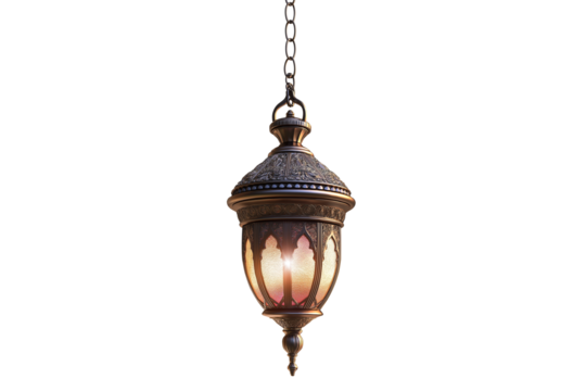 Elegant blue and gold hanging lantern with intricate designs and lit interior on transparent background for home decor