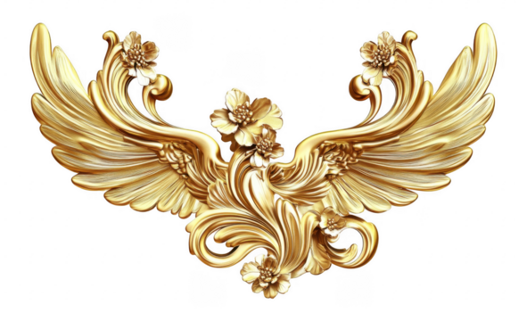 Ornate floral decor element featuring intricate golden scrollwork and a central flower design against a transparent background for versatile design applications