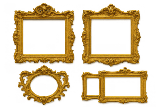 Gold ornate baroque picture frames set with transparent background for vintage art and photo display