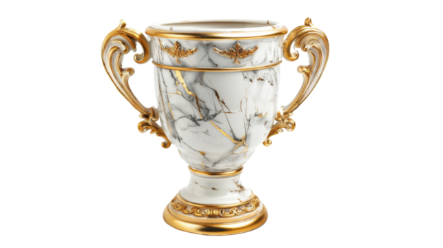 A gleaming golden trophy with ornate handles and a tiered pedestal, adorned with a flowing red ribbon, symbolizes victory and celebration against a stark black background, its polished surface catchin