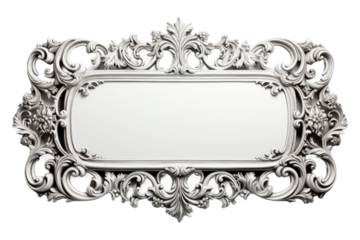 Ornate Silver Frame. A detailed ornate silver frame stands against a plain white background showcasing intricate designs and patterns. on White or PNG Transparent Background.