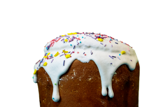 Iced Easter Kulich with Vibrant Confectionery Decor Isolated Close-Up