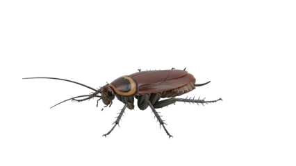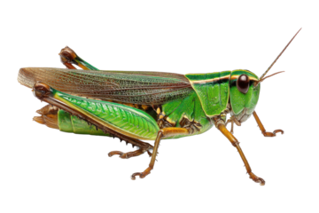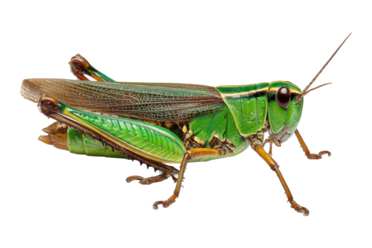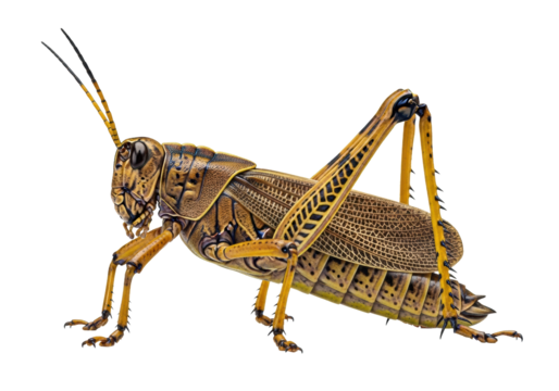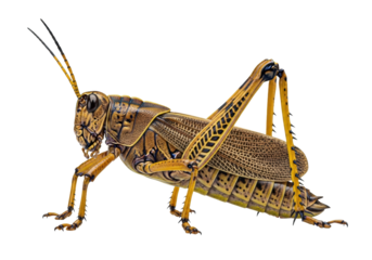 extreme macro profile of a robust brown grasshopper with vibrant yellow, spined legs on a transparent background, shadowless clinical light, concept of anatomical perfection