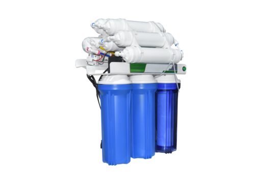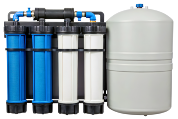 Reverse osmosis water filtration system with multiple cartridges isolated with transparent background