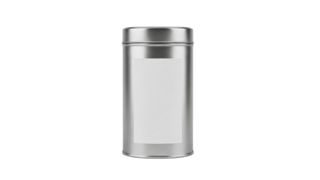 A sleek silver metal container with a blank white label offers versatile product packaging for tea, coffee, spices, or other dry goods, perfect for branding and merchandise presentations.