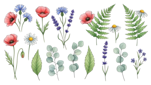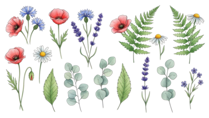 Flowers and leaves set, floral watercolor illustration for greeting card, invitation and other printing design. Isolated on white. Wild flowers hand drawing.