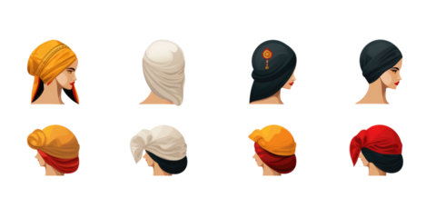 set of vintage classic history head ottoman Turkish empire women head cover hat in different color styles for, isolated on a white transparent background