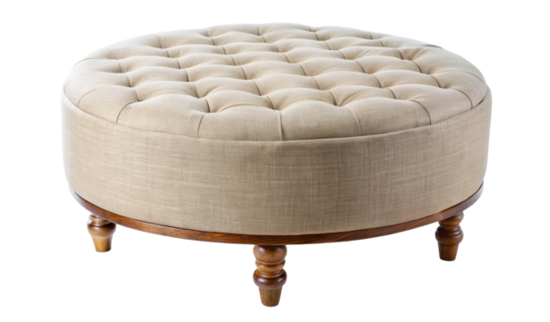 Tufted round ottoman with wooden legs isolated on a transparent background