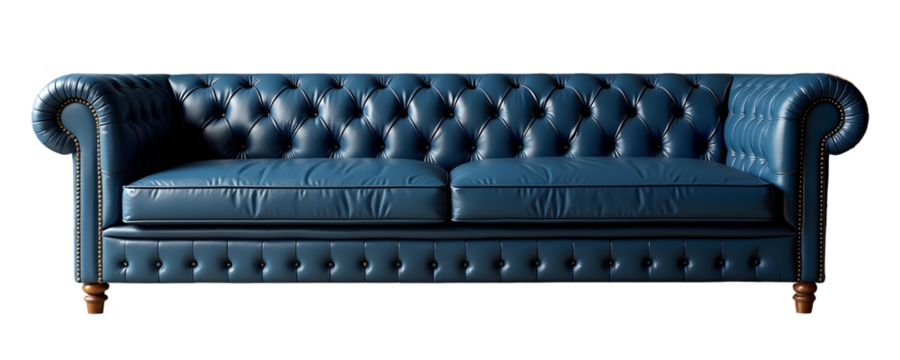 Experience opulence with this exquisite navy blue leather chesterfield sofa. Its button tufting and wooden legs exude timeless elegance and refined luxury. Perfect for sophisticated interiors!, cut ou